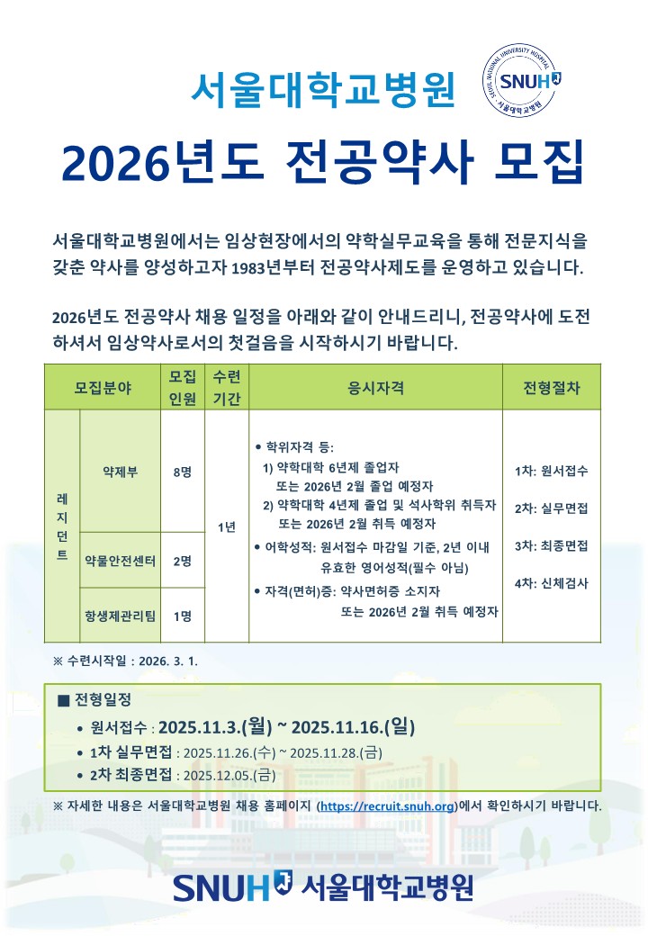 붙임1. 2026년도 서울대학교병원 전공약사 채용 포스터.pdf (539.6 KB)