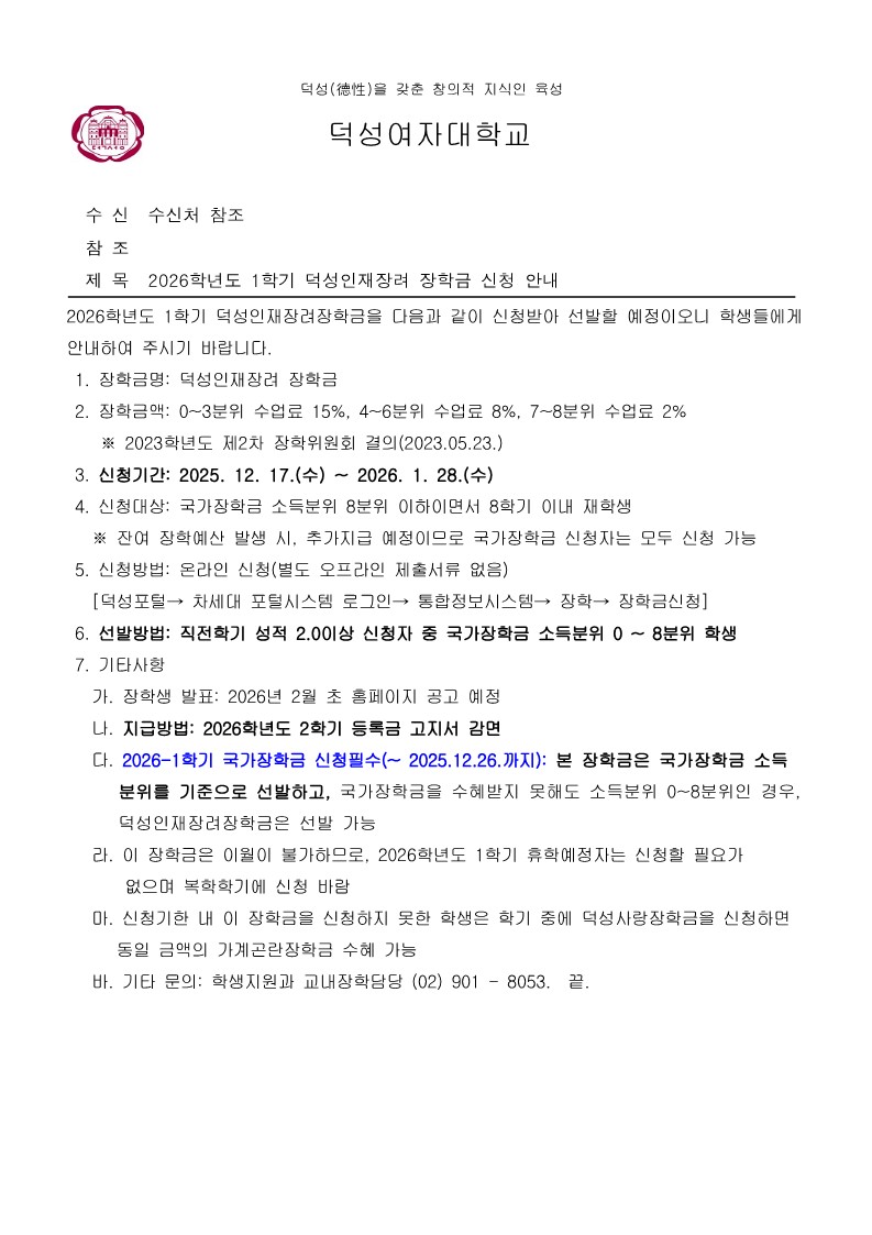2026학년도 1학기 덕성인재장려 장학금 신청 안내