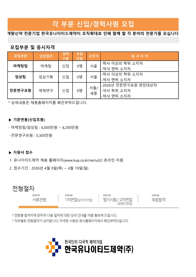 [한국유나이티드제약] 마케팅팀/임상팀/전문연구요원 모집