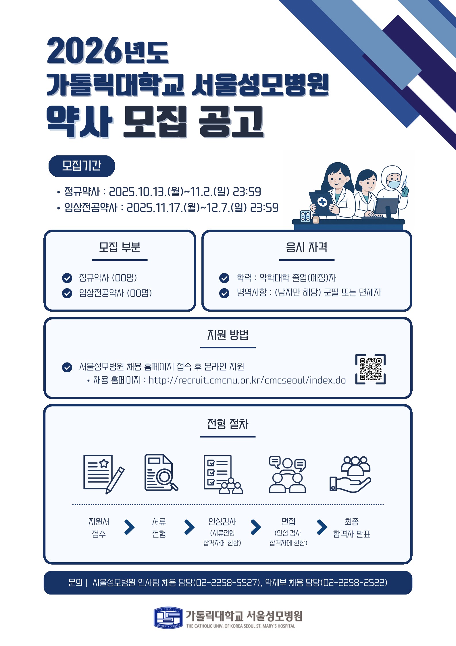 자세한 내용은 첨부파일 참고 바라며 문의사항 있을 시 약제부 채용담당자(Tel. 02-2258-2522)에게 연락주시기 바랍니다.